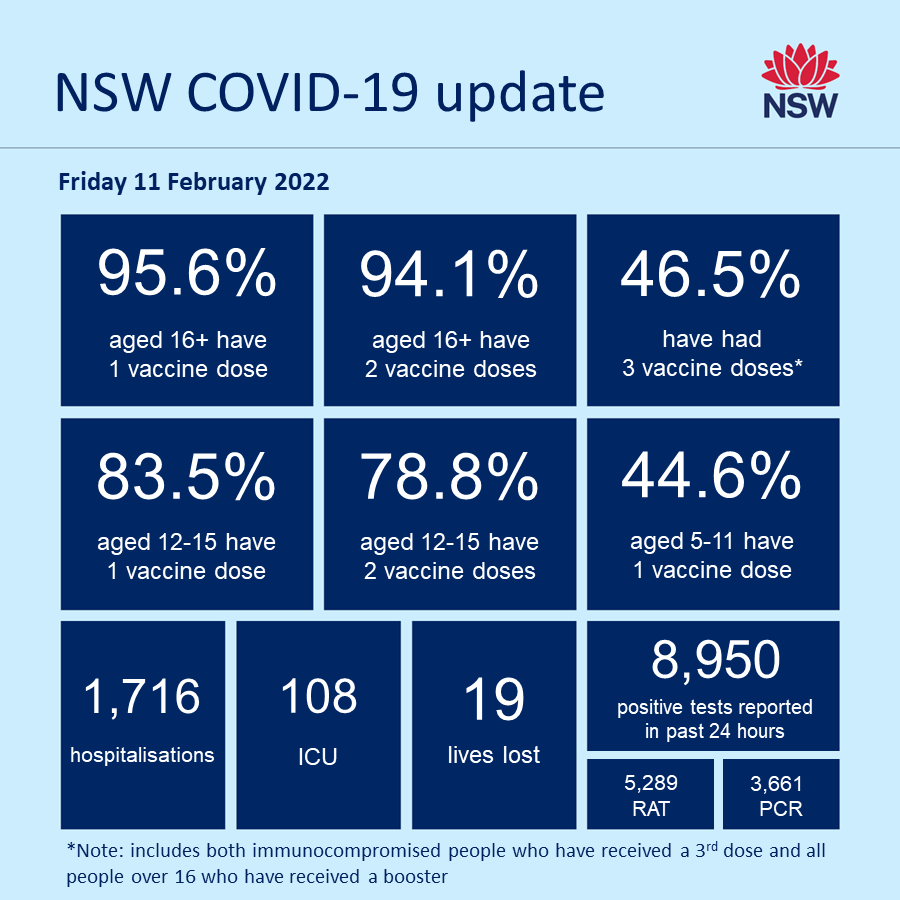Nsw Health On Twitter Nsw Covid 19 Update Friday 11 February 2022 In The 24 Hour Reporting Period To 4pm Yesterday 95 6 Of People Aged 16 Have Had One Dose Of A